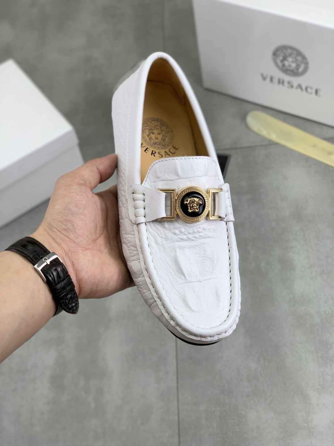 Этот обувь имеет качество 1:1 (превосходное). Используемые материалы идентичны оригинальным. Знаки товарных знаков Версаче не поддаются аутентификации. Фотографии, сделанные фактическим обувь, то, что вы получите, будут на 100% одинаковыми с нашими фотографиями.